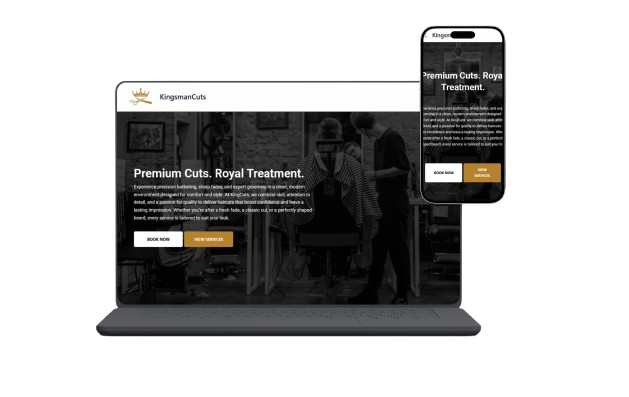 Modern barber shop website concept featuring an integrated booking system, service showcase, and bold visual identity. Designed to demonstrate appointment functionality, strong brand presence, and seamless mobile experience.